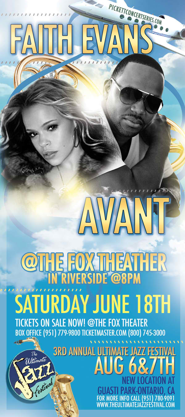 FAITH EVANS with AVANT @ The Fox Theatre Riverside, Ca. June 18th & THE ULTIMATE JAZZ FESTIVAL @ Guasti Park Ontario, Ca. Aug 6th & 7th For complete listings of ALL PICKETT CONCERT SERIES go to: or call |